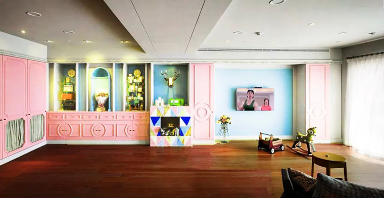 甜美的粉色櫥柜與相鄰的明亮藍(lán)色電視背景墻形成了美妙的色彩沖突,這是一個(gè)年輕的色調(diào)搭配,也是一種情感色彩的組合,感覺(jué)就像一個(gè)快樂(lè)的擁抱,木地板被用于整個(gè)室內(nèi),建立額外的紋理感。