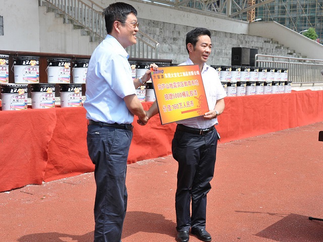 2013年6月28日上午,一場(chǎng)傳遞正能量的捐贈(zèng)活動(dòng)在四川省雅安市蘆山中學(xué)的操場(chǎng)上舉行,東莞大寶化工制品有限公司向蘆山地震災(zāi)區(qū)的教育系統(tǒng)捐贈(zèng)了5000桶環(huán)保油漆,總價(jià)值160萬(wàn)元。陳春華總經(jīng)理、葉子琛執(zhí)行經(jīng)理等領(lǐng)導(dǎo)出席儀式,蘆山縣教育局局長(zhǎng)朱文華作為代表接受捐贈(zèng)。