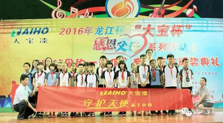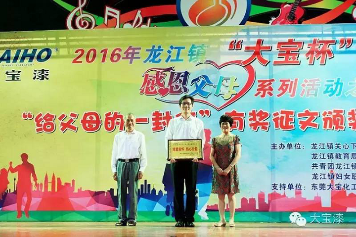 5月20日,由佛山龍江鎮(zhèn)教育局、龍江鎮(zhèn)關(guān)心下一代委員會(huì)與大寶漆共同主辦的2016年龍江鎮(zhèn)“大寶杯”感恩父母系列活動(dòng)之“給父母的一封信”有獎(jiǎng)?wù)魑念C獎(jiǎng)典禮在龍江鎮(zhèn)城區(qū)中心小學(xué)舉辦。佛山龍江鎮(zhèn)教育局和龍江鎮(zhèn)關(guān)心下一代委員會(huì)在頒獎(jiǎng)典禮上授予大寶漆“博愛慈懷熱心公益”稱號(hào)。大寶化工企劃部楊忠榮副理、龍江鎮(zhèn)關(guān)心下一代工作委員會(huì)麥煥橋主任、獲獎(jiǎng)小學(xué)生及其家長(zhǎng)出席了本次頒獎(jiǎng)典禮。