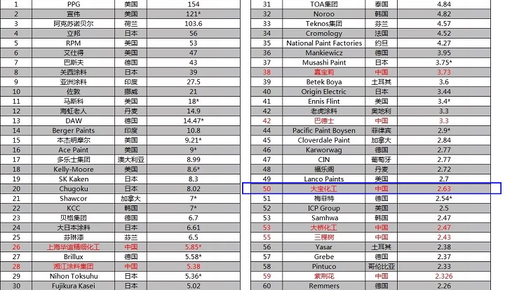 近日,美國(guó)《涂料世界》(Coatings World)雜志發(fā)布了2019年全球頂級(jí)涂料制造企業(yè)排行榜。本次上榜共82家公司,入圍門檻為2018年銷售額超過1億美元。榜單是基于涂料業(yè)務(wù)年銷售額(以美元計(jì))排名。知名涂料品牌大寶漆,此次再次上榜,位列第50名。這已經(jīng)是大寶漆連續(xù)多年登上該排行榜。