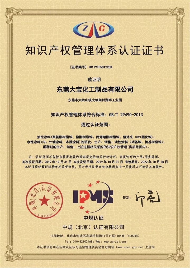 2019年10月31日,東莞大寶化工順利通過GB/T29490-2013知識產(chǎn)權(quán)管理體系認(rèn)證,獲得中規(guī)(北京)認(rèn)證有限公司頒發(fā)的認(rèn)證證書。通過認(rèn)證范圍包括:油性涂料(聚氨酯樹脂漆、聚酯樹脂漆、丙烯酸酯樹脂漆、紫外光(UV)固化漆)、水性涂料(內(nèi)、外墻涂料,木器涂料)的研發(fā)、生產(chǎn)、銷售;油性涂料(硝基漆、氨基樹脂漆)、稀釋劑的生產(chǎn)、銷售等涉及的知識產(chǎn)權(quán)管理。