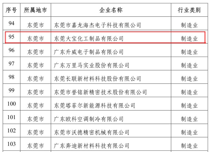 11月20日,第十八批廣東省省級(jí)企業(yè)技術(shù)中心名單于廣東省工業(yè)和信息化廳官網(wǎng)正式公布。其中,東莞大寶化工制品有限公司榜上有名。