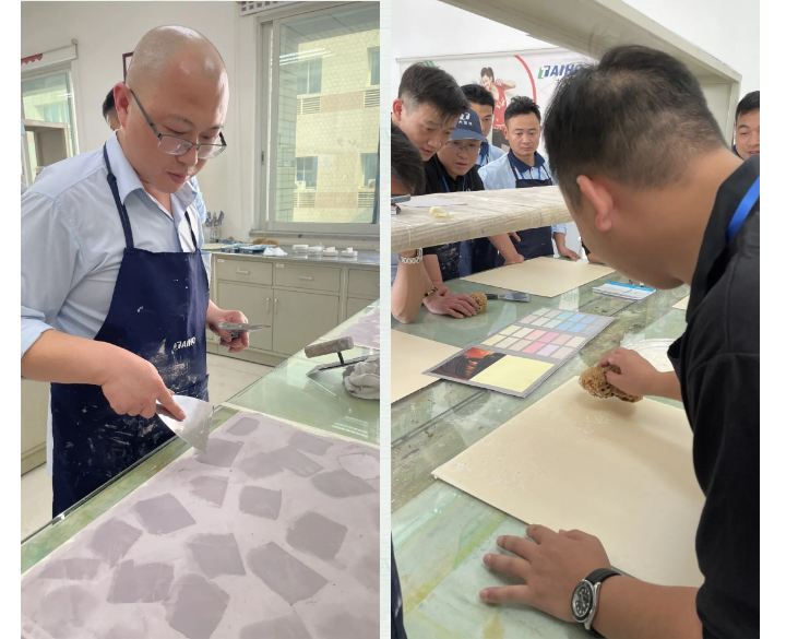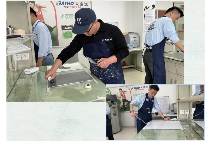 藝術涂料培訓采用理論與實踐相結合,秉承“學完即會”的宗旨,使參訓人員學會藝術涂料施工技能,掌握藝術涂料產(chǎn)品銷售技巧。培訓采用教練技術進行,即第一步:講給學員聽,第二步:做給學員看,第三步:學員做給老師看,第四步:進行指導和糾正。通過學習后,學員學會制作3D銀箔、絲綢幻彩、三色珠光、米蘭絲絨、天然彩陶砂、無機灰泥、貝殼絲絨、雅晶石、天鵝絨和2021年的新效果:清水混凝土等工藝效果。