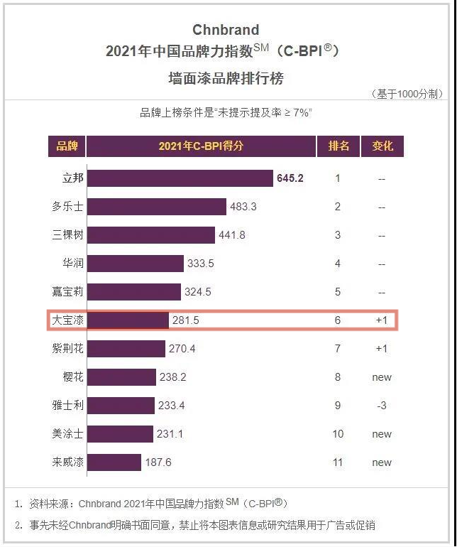 4月20日,國內(nèi)品牌評級權(quán)威機構(gòu)Chnbrand發(fā)布2021年(第十一屆)中國品牌力指數(shù)SM(C-BPI®)品牌排名和分析報告,大寶漆再次入榜。