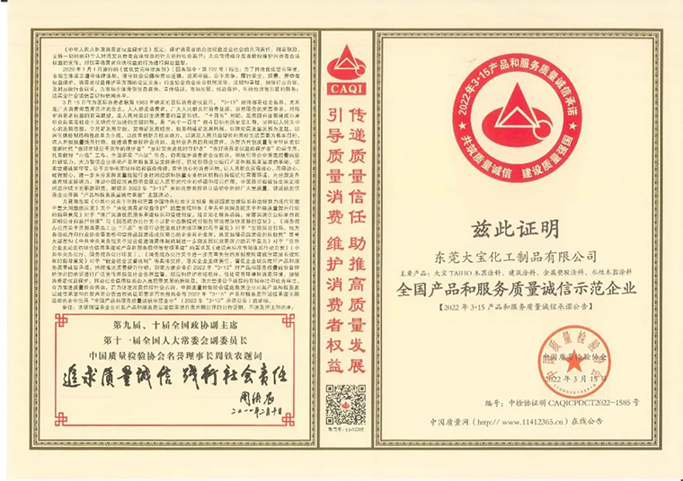 榮譽(yù),是對大寶漆的肯定,更是推動(dòng)大寶漆不斷向前發(fā)展的動(dòng)力!未來,大寶漆仍將不忘初心,始終專注于高品質(zhì)涂料的研發(fā)推廣,積極恪守質(zhì)量誠信,踐行社會(huì)責(zé)任,以微薄之力助推國家“質(zhì)量強(qiáng)國”建設(shè)。