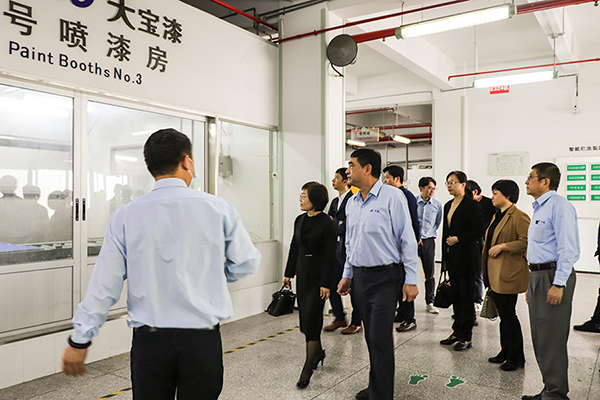 張總表示很榮幸邀請(qǐng)到重固鎮(zhèn)的領(lǐng)導(dǎo)們?cè)诎倜χ谐榭盏轿宜具M(jìn)行指導(dǎo),并向來(lái)訪領(lǐng)導(dǎo)介紹大寶國(guó)際的發(fā)展歷程。先后陪同參觀中央實(shí)驗(yàn)室、安管中心、智能水性涂裝線、生產(chǎn)車(chē)間、污水處理中心和廢氣處理站等,工作人員詳細(xì)介紹各區(qū)域的運(yùn)作情況。