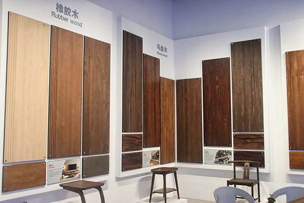 其展示精致與美學(xué)共存的色板,以黑檀、烏金木、白蠟?zāi)?、黑胡桃和奧古曼等為代表的多種素材,呈現(xiàn)了色彩多樣化,工藝環(huán)?;厔?shì),滿足了用戶對(duì)于不同風(fēng)格的需求。