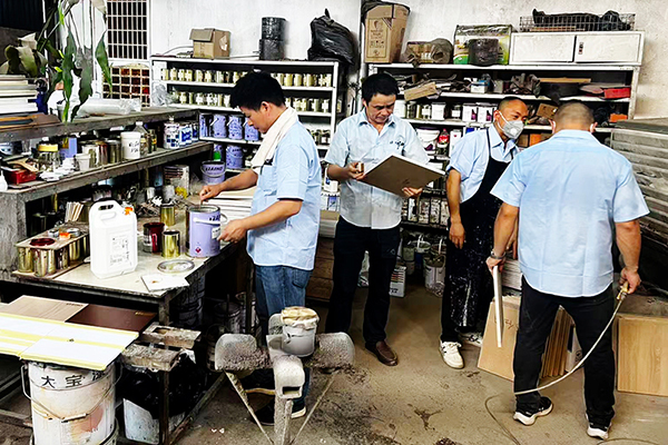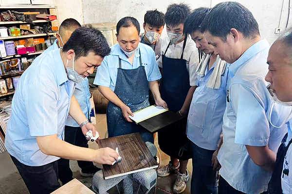 理論課程后,趙副理帶領(lǐng)大家投入色板制作實戰(zhàn)。從白胚檢查、砂光處理,到底色施工、底漆噴涂、修色及面漆完工,每一個環(huán)節(jié)都結(jié)合產(chǎn)品特性與配比要求進(jìn)行實操演練,幫助大家真正掌握完整工藝流程,提升在實際服務(wù)中的應(yīng)對能力。