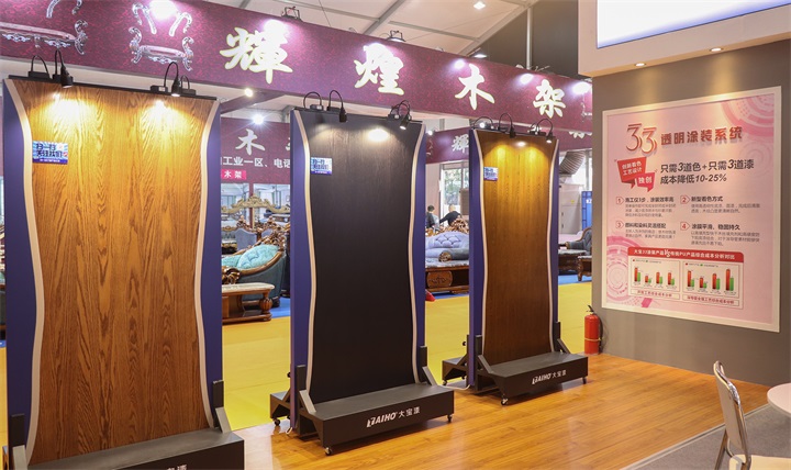 此外,還展示了大寶漆獨創(chuàng)的只需三道色+3道漆的著色工藝——”33透明涂裝系統(tǒng)”和著色后凸顯木材紋理層次的“格麗斯著色系列”。