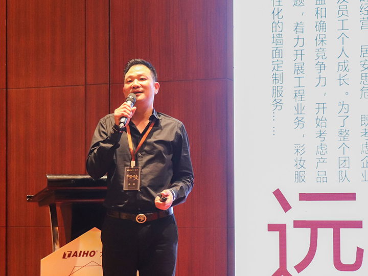 隨后,家裝事業(yè)部經理黃文敏作家裝漆總結報告。他通過成功經營案例、大寶漆2019年市場布局為經銷商加油打氣。他指出,公司將通過內部整合、外部資源運用,和經銷商協(xié)同謀贏,再創(chuàng)佳績。