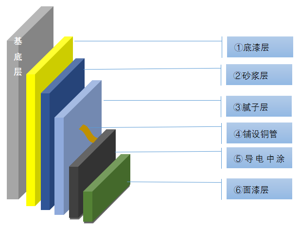 橫、縱向間隔4m(或按設(shè)計要求)鋪設(shè)銅箔(銅箔上用EPD-401A/B封閉一遍) |