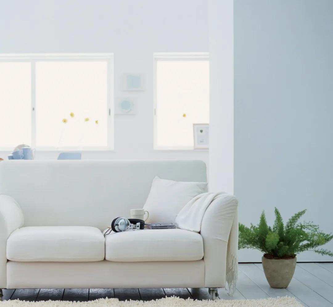 配色整體以淡藍色為主,形成樸素、靜謐的氛圍。用白色的沙發(fā)、書架加以中和,很好地創(chuàng)造出寧靜的空間質感。