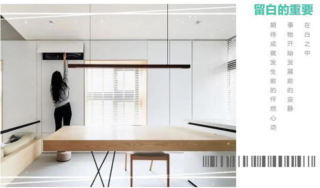 現(xiàn)代社會(huì)信息量龐大,試著在生活中拿掉些甚么,提醒自己適當(dāng)放松卻又不能太過(guò),「平衡」是留白哲學(xué)的關(guān)鍵之一,為緊湊的生活建置一小塊能夠呼吸的空間給自己,慢慢領(lǐng)略是「時(shí)間」讓空間中的留白發(fā)揮了作用。